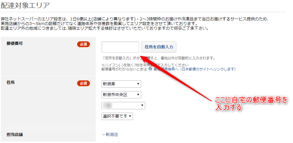 下記のページに飛ぶので自宅の郵便番号を入れると配送エリアかどうかが分かります。