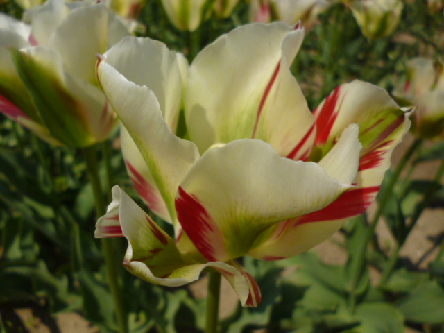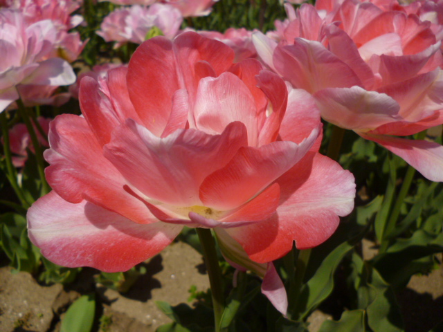 変わり種のチューリップ。花びらの形や、色もピンクと白のツートンで。