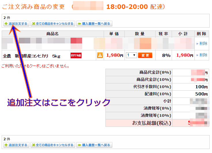 ログイン⇒ 購入履歴から「追加注文する」をクリック。
