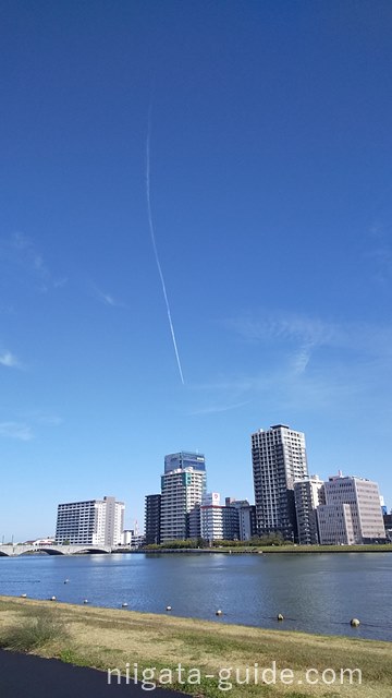 おお、空には飛行機雲。こうやってみると、新潟ってステキなまちですよね。