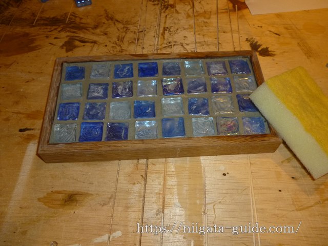 ものづくり体験でつくったタイルトレー。今はコップ置きになっています。