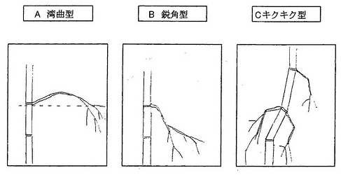C:枝が根元から鋭角に曲がるか、節と節の間で曲がらず枝の節のところで曲がるのが目立つもの。