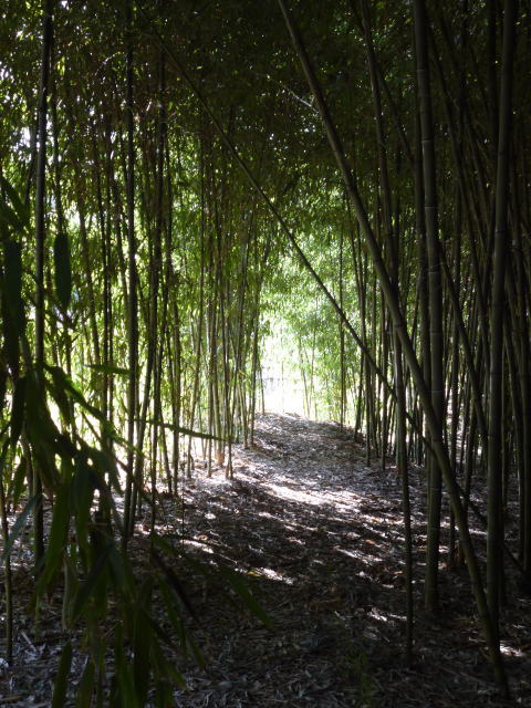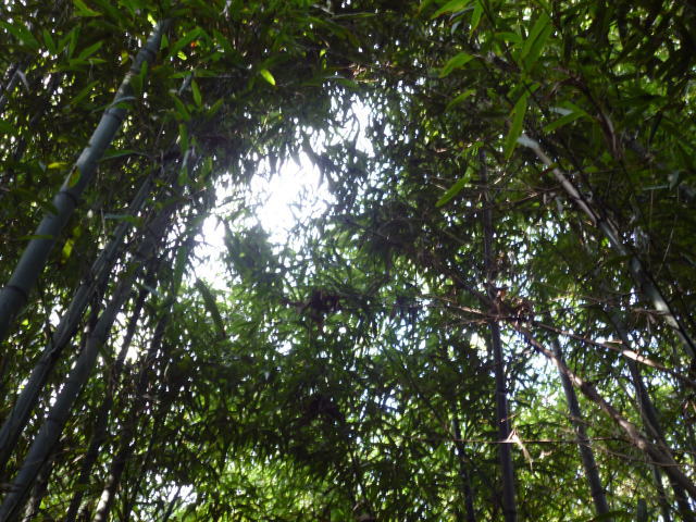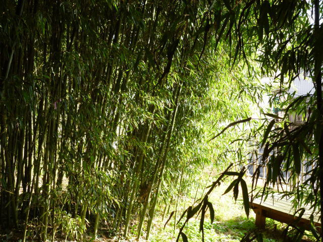 日が差しているところはきれいな竹やぶが見えますが、中は薄暗く、うっそうとしています。
