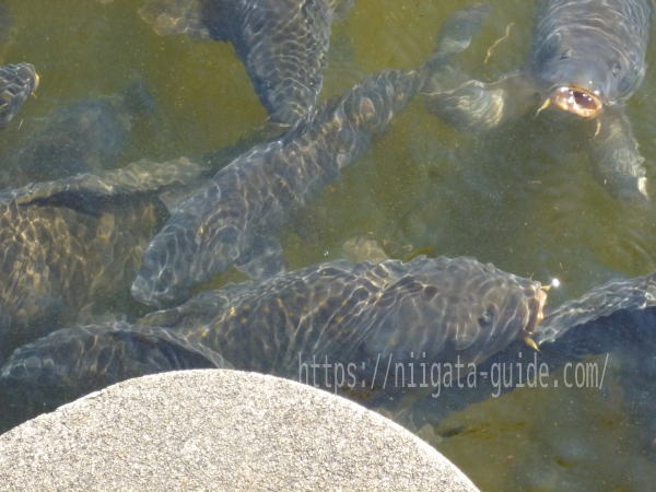 鯉は、えさをあげる人間が近寄ると、人の気配を感じ素早く寄ってきて口をパクパクします。