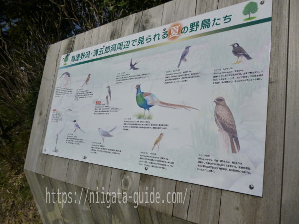 「鳥屋野潟周辺で見られる鳥たち」の看板があります。