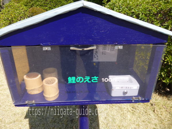 小さい生まれたばかりの鯉や、大きな鯉まで。鯉の餌が100円で売っています。右のボックスにお金を入れて、竹の入れ物に入っている餌をとって、池の鯉にえさをやります。